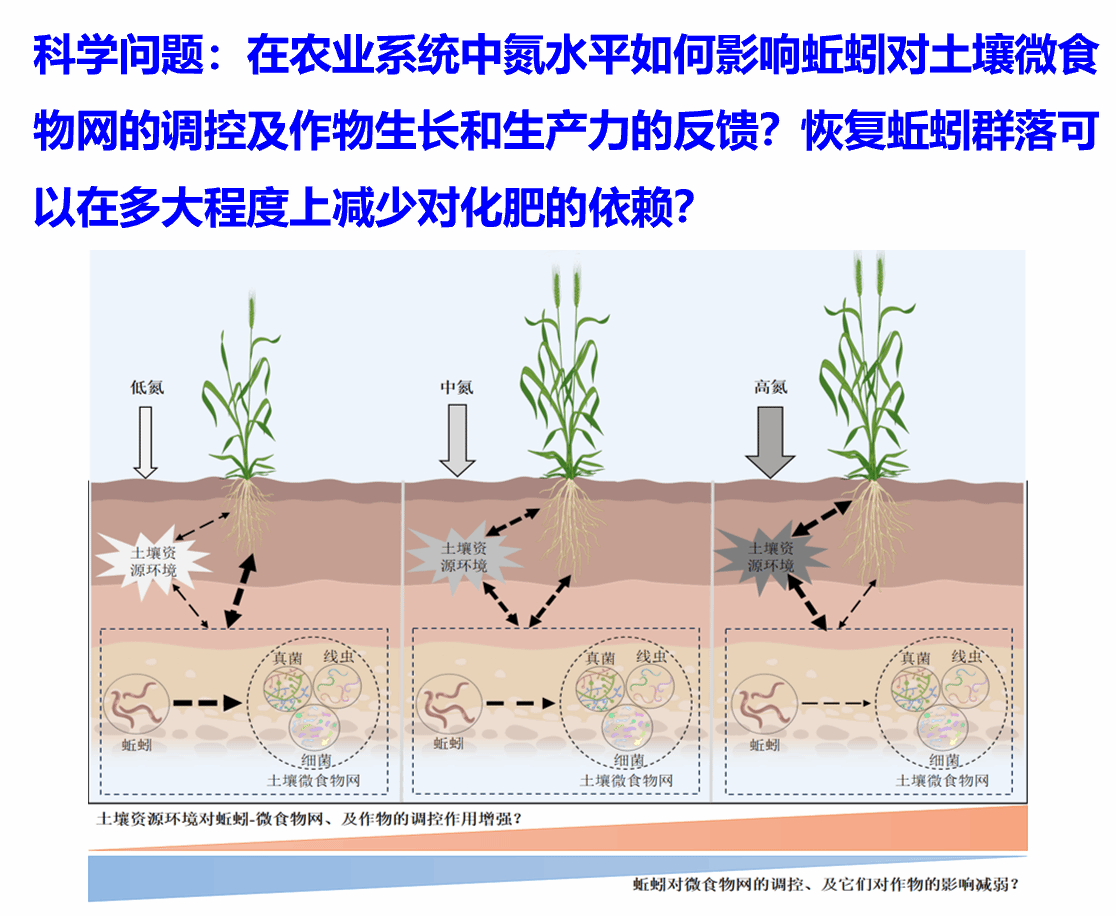邵元虎做了题为“蚯蚓在玉米-小麦轮作体系中的减氮增产效应及其土壤微食物网调控机制”的专题报告。该研究聚焦“氮肥水平如何影响蚯蚓调控土壤微食物网及作物响应”这一关键科学问题,通过控制试验揭示了在玉米-小麦轮作体系中,合理利用蚯蚓可在减少氮肥施用30%的条件下,维持粮食产量。而可能的机理是蚯蚓在合理减氮条件下可通过激活有益线虫、抑制病原线虫、增强土壤微食物网内生物网络互作等途径,显著提升作物产量与氮肥利用效率。该工作创新性阐明了蚯蚓生物调控效应与氮输入水平的耦合关系,为华北地区农业系统减氮稳产、推动绿色转型提供了重要机理依据,也为国家“藏粮于地、藏粮于技”与农业可持续发展战略提供了科学与实践支撑。