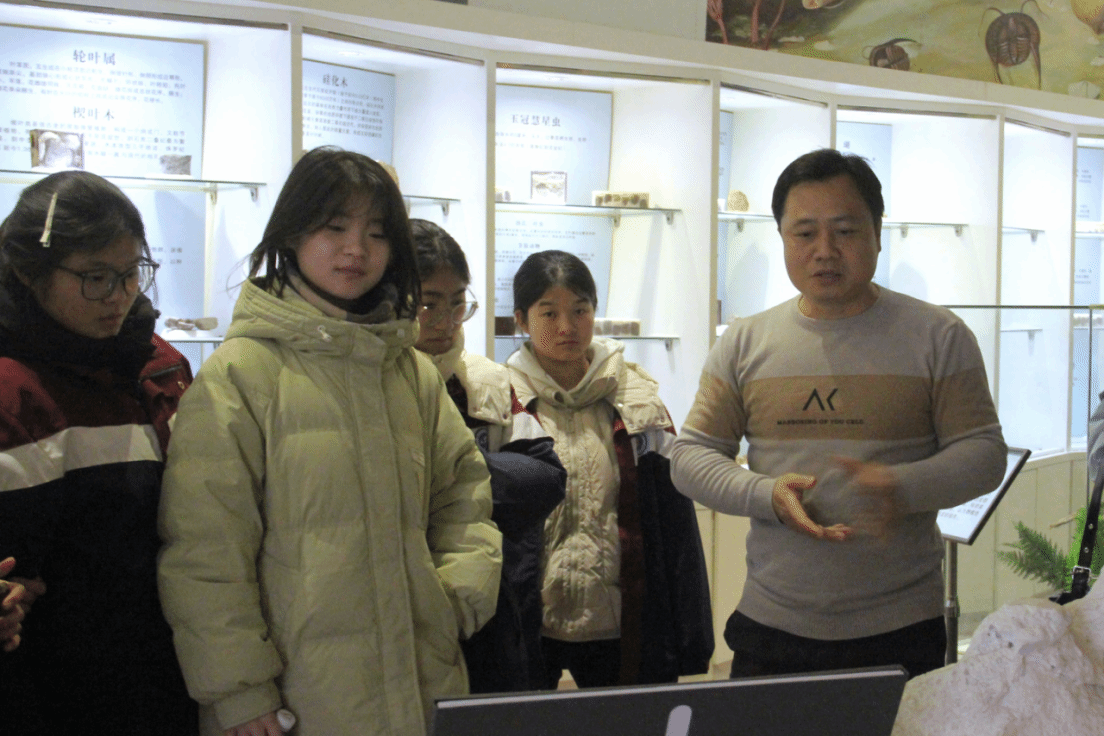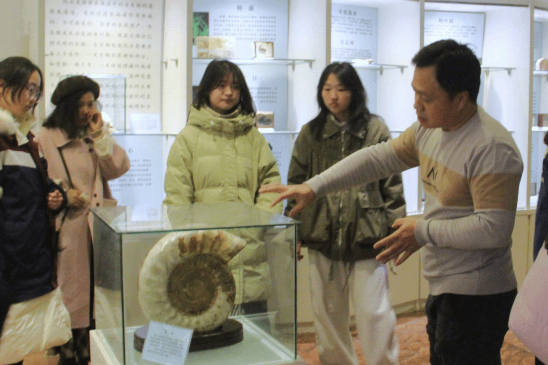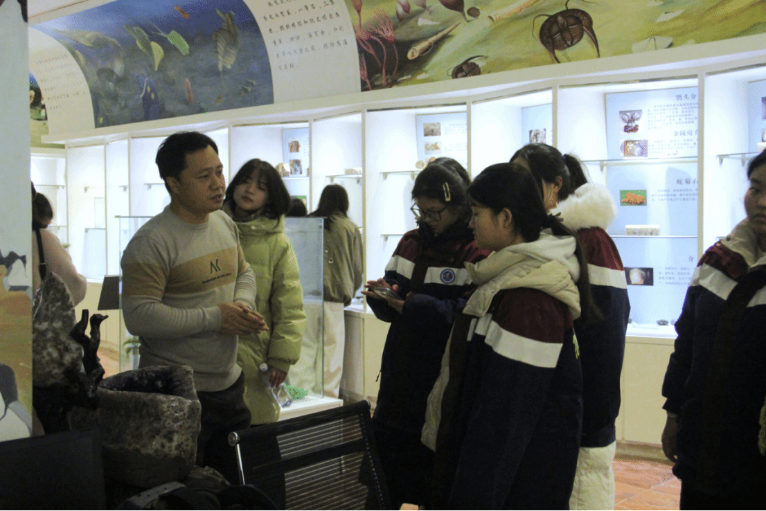 随后,研学团队前往东英自然博物馆参观学习。陈英勇老师带领学生依次参观岩石、矿物及古生物化石展区,并结合典型展品与学生进行互动交流,引导大家从标本形态、成因特征等方面观察与思考地质演化的过程。参观过程中,学生们认真聆听讲解,不时驻足讨论,在交流与探究中逐步加深了对地学相关内容的整体认识。