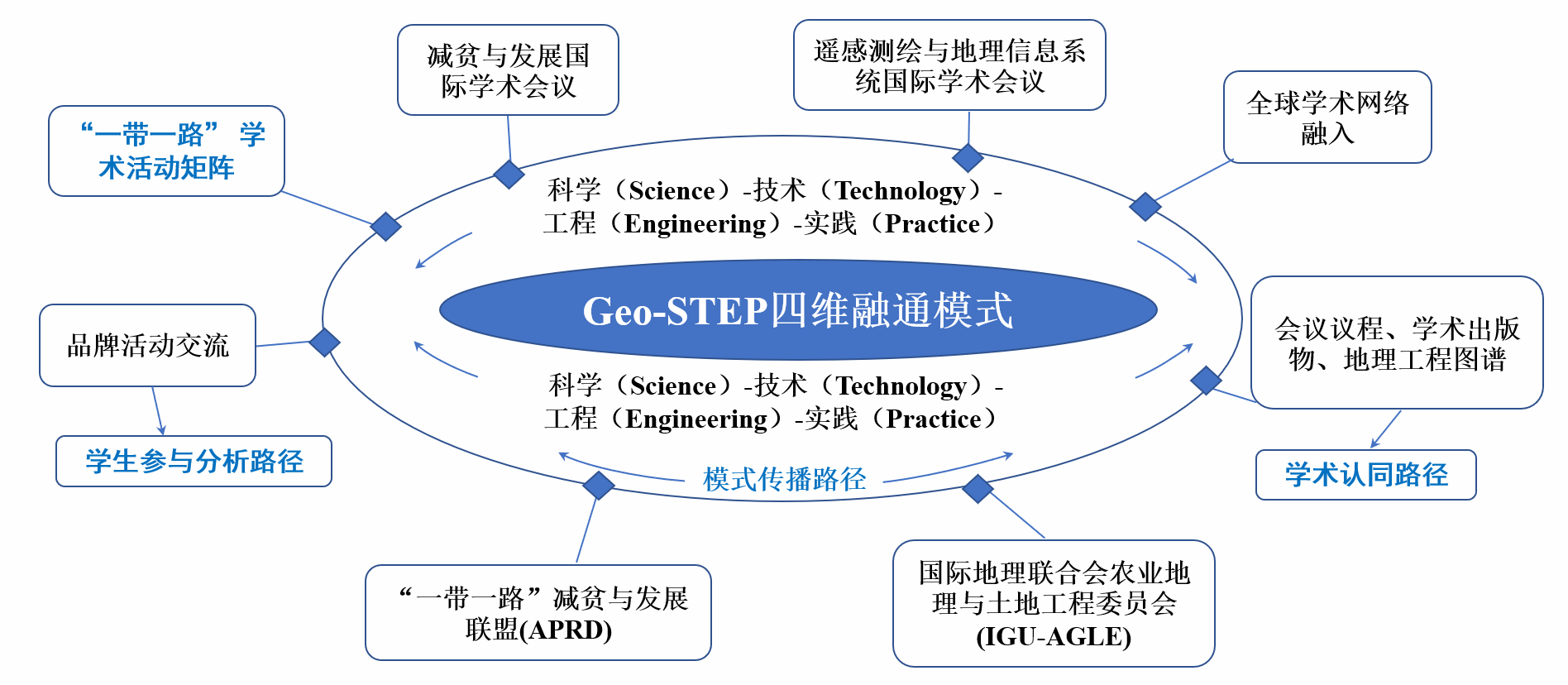 该项目聚焦“地理科学工程化实践”与“教育与人文走出去”交叉领域,以Geo-STEP(Science-Technology-Engineering-Practice)四维融通模式为核心,构建“理念引领 —平台聚合—技术支撑”的国际化发展体系。该项目旨在通过三大核心板块推进国际化实践:一是依托“一带一路”减贫与发展联盟(APRD)、国际地理联合会农业地理与土地工程委员会(IGU-AGLE)等国际平台,通过主办国际学术会议、出版专著教材等形式,推动Geo-STEP模式的国际化传播;二是依托地理学智慧教学平台,开发虚拟仿真课程与国际化交流资源库,形成地理工程领域的数字化教育资源体系,精准对接“一带一路”沿线国家发展需求;三是深化工程化应用实践,依托国家乡村振兴(兰考)研究院、地理工程小院等载体,将中国土地整治、乡村减贫、生态修复的成功经验转化为国际可复制的教学案例,通过国际暑期学校、联合野外实习等品牌活动实现技术落地与人才共育,为地理科学工程化实践“走出去”提供中国方案。